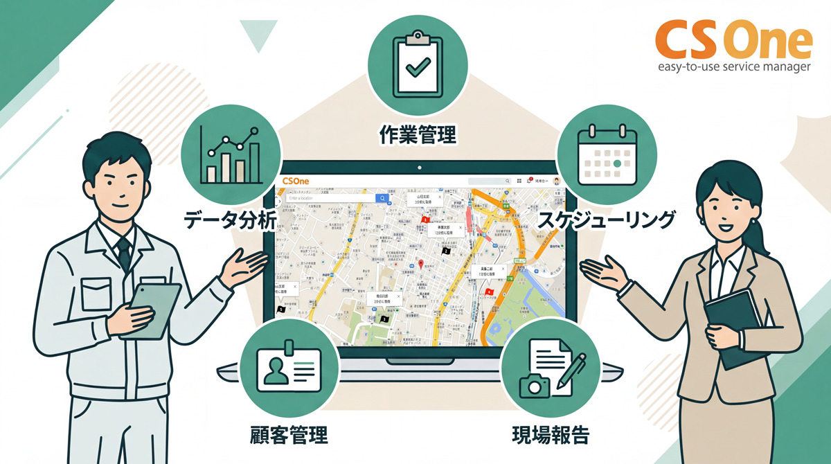 CSOneのシステムを使えば、作業報告書を電子化し、サービスマンの生産性を大幅に上げることが可能である。