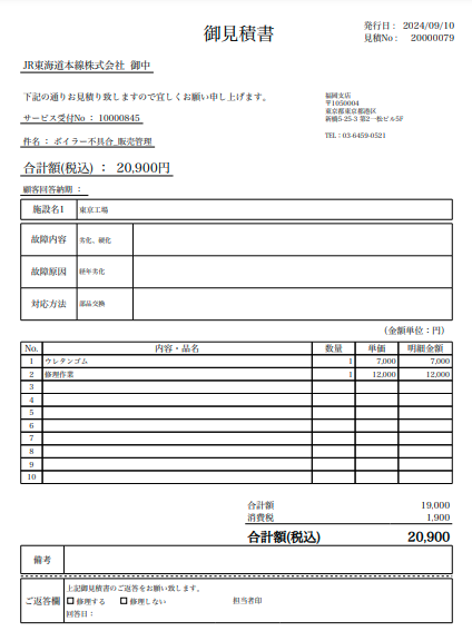 In the case of an emergency request, a service technician is dispatched and proceeds directly to the site. Depending on the company, there are cases where a quotation is submitted and customer approval is obtained before the site visit. In this example, however, priority is given to the on-site visit.