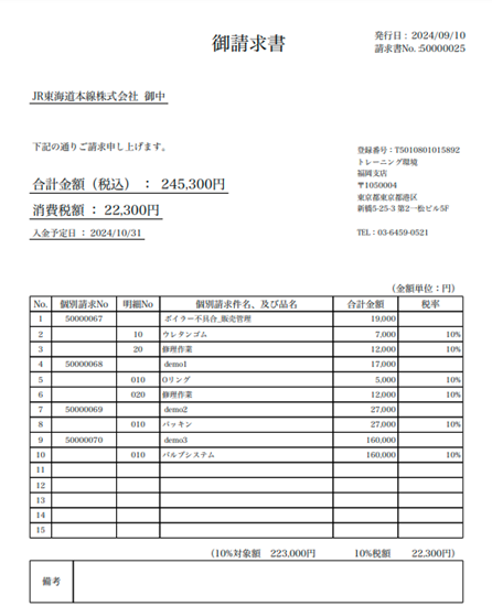 By clicking the payment proposal button, the system displays the total amount expected to be received from JR Tokaido Main Line Co. by October 31, 2024. In this case, the amount is shown as JPY 245,300.