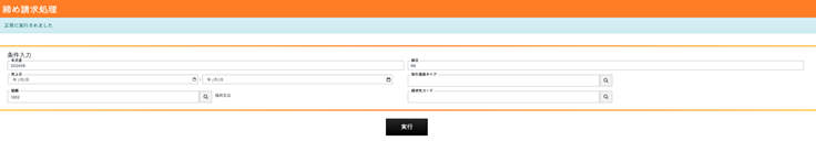 From the closing invoice processing screen, the user simply enters the relevant conditions. In this example, since the target cases are from September 2024, “202409” is entered in the year–month field, and the process is executed.