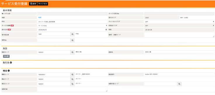 The first step is to register the service case in the system. In this example, we assume that an inquiry has been received from a fictional customer, JR Tokaido Main Line Co., reporting a malfunction in a boiler. The customer’s site is set as the Tokyo Plant.