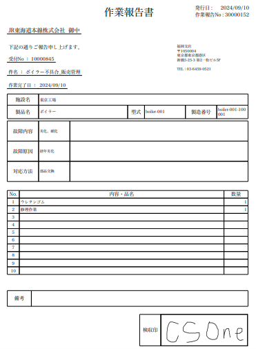 After receiving the malfunction report and arriving at the factory, the service technician inspects the boiler and determines that the root cause is wear and tear. As a result, replacing a part—urethane rubber—is identified as the appropriate corrective action. Accordingly, the required part (urethane rubber) and the repair labor cost are entered in the report details section.