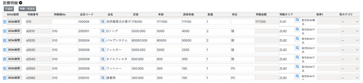 As a result, a list of parts appears in the Quotation Details section. This list is automatically proposed by the system based on the combination of the equipment information (Boiler) and the selected maintenance content (1-Year Service). The target boiler is displayed at the top, followed by a list of its constituent parts. The system also proposes the price for each part and the required quantity for the service.