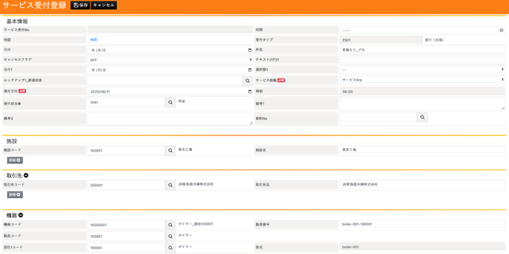 CSOne manages basic customer information like the above as master data within the system. Therefore, staff do not need to input facility, client, and equipment information from scratch; they simply select from the proposed options. This makes the system accessible even for less-experienced employees.