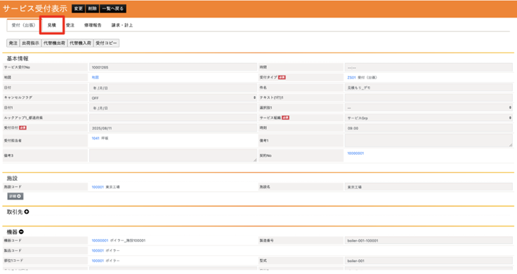 First, the basic customer information is entered via the Service Acceptance Registration screen. We select the Tokyo Factory for the facility and JR Tokaido Line Co., Ltd. as the client. Next, we select the boiler—the target equipment for this maintenance proposal—in the Equipment Information section.